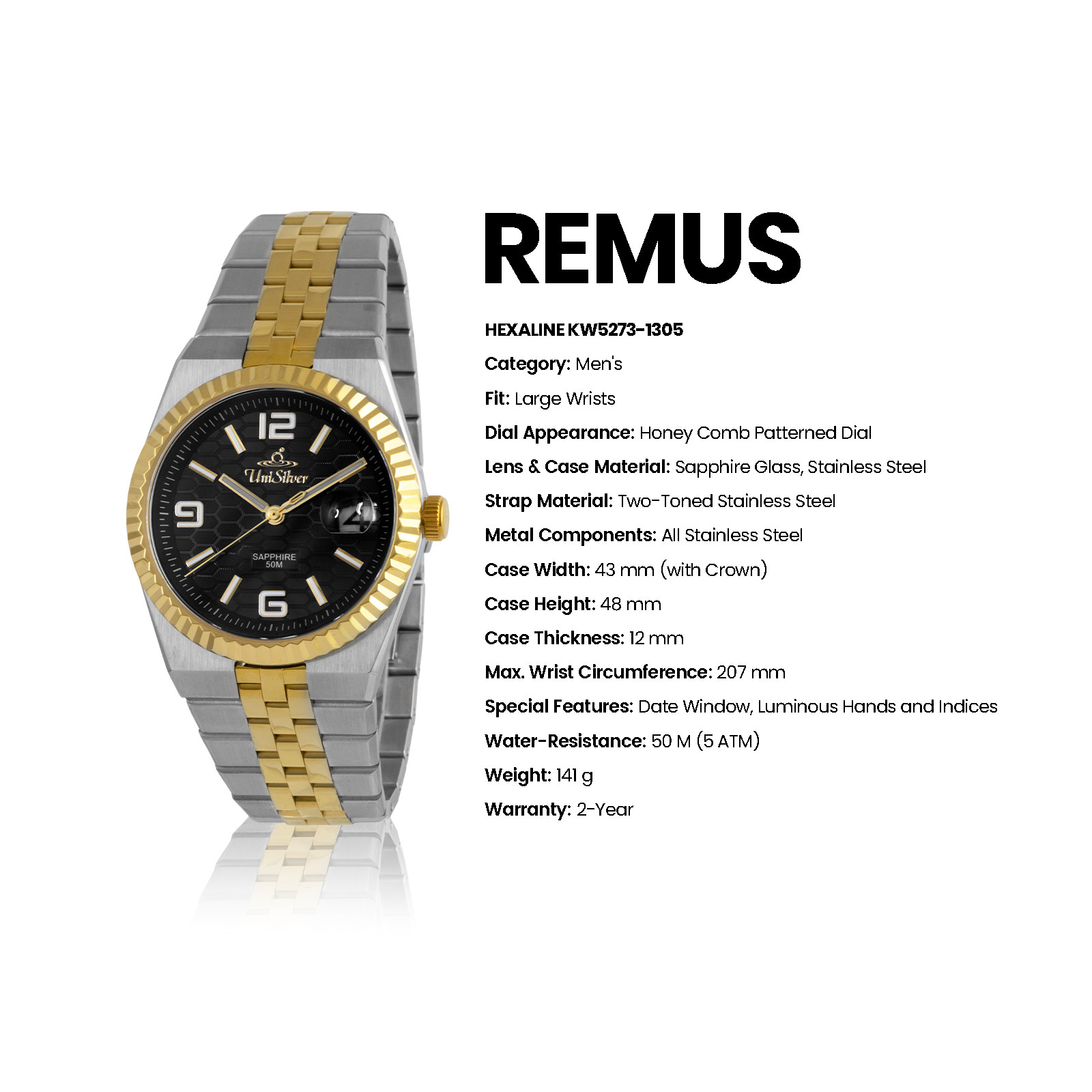 With luminous hands, a practical date window, and 50M water resistance, the Remus Hexaline easily moves from day-to-day wear to more refined occasions.