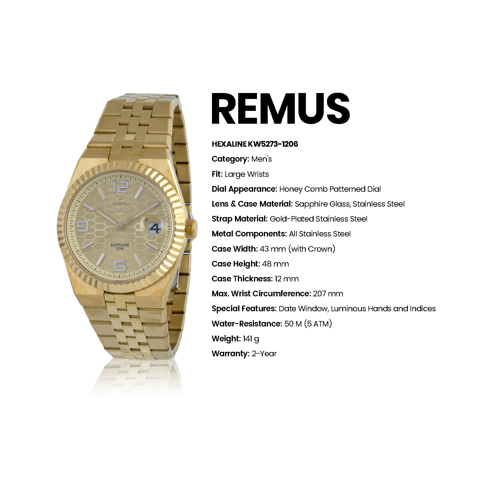 With luminous hands, a practical date window, and 50M water resistance, the Remus Hexaline easily moves from day-to-day wear to more refined occasions.