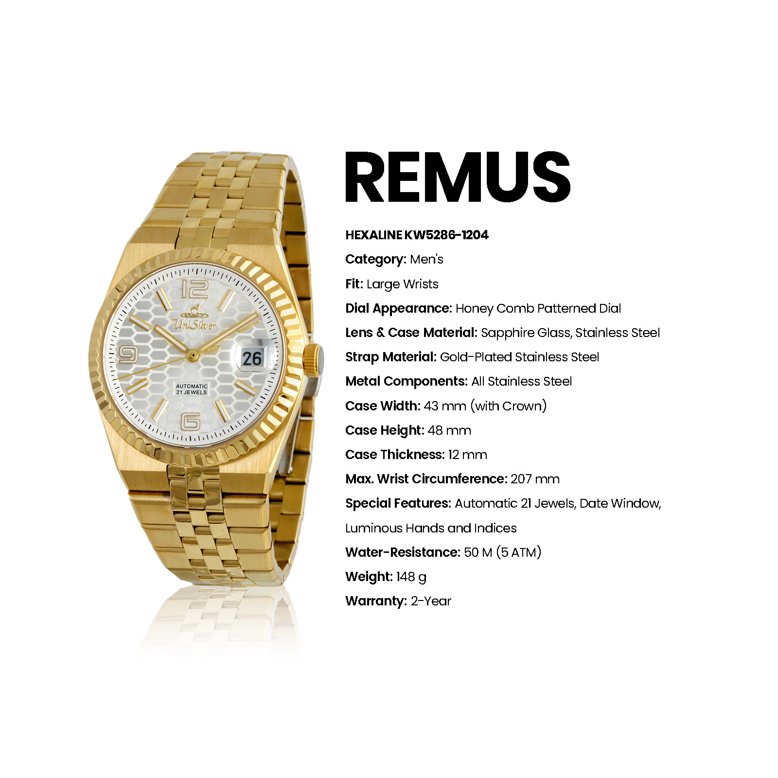 Equipped with luminous hands and markers, a practical date window, and 50M water resistance, the Remus Hexaline is designed to adapt effortlessly from routine days to more polished settings.