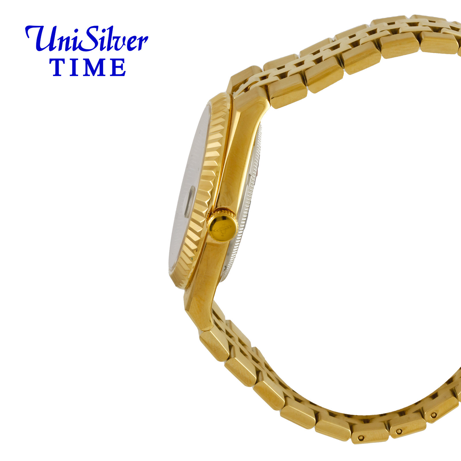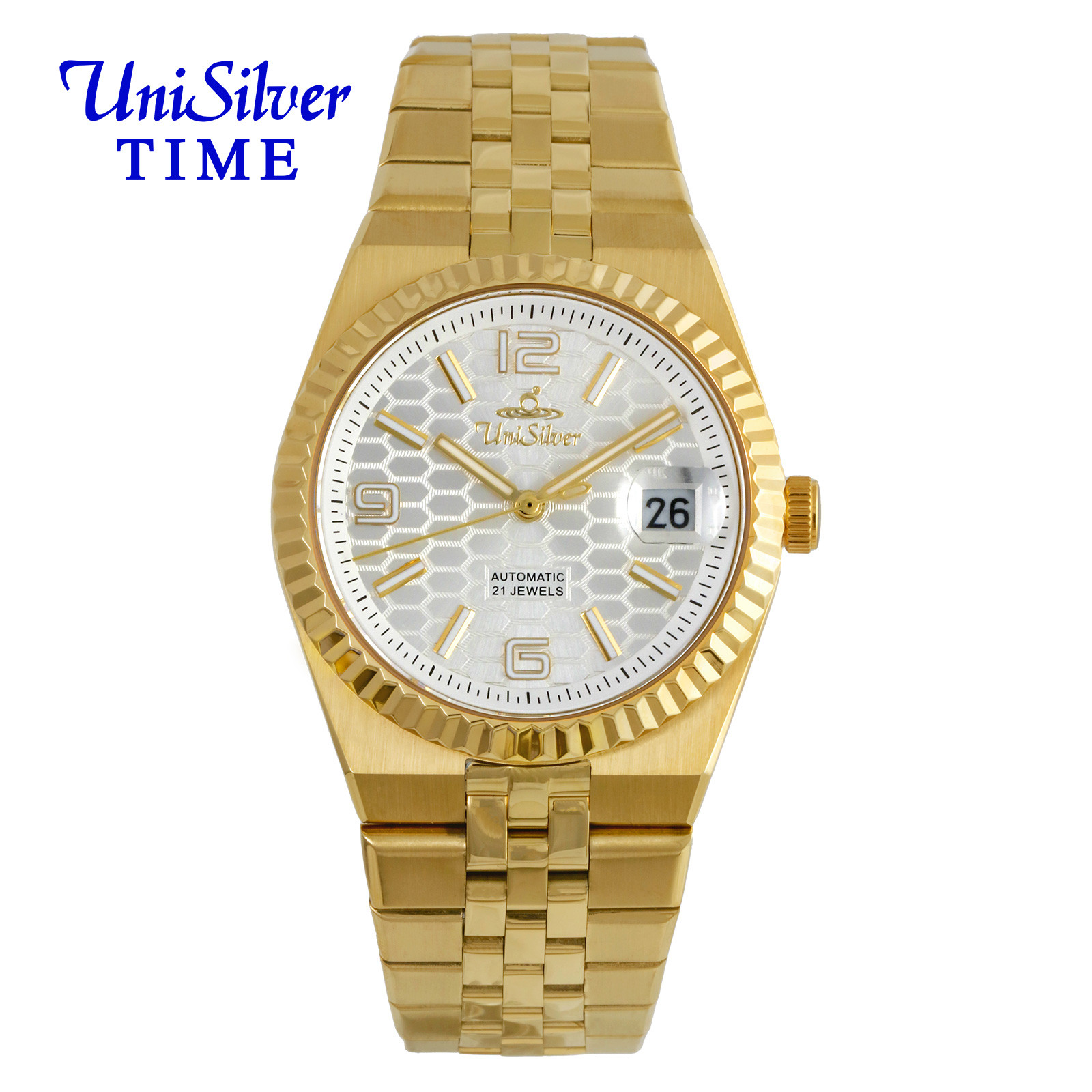 At its core is a self-winding 21-jewel movement, visible through an exhibition case back, delivering consistent performance without the need for a battery. The stainless steel construction and scratch-resistant sapphire crystal ensure lasting durability for everyday use.