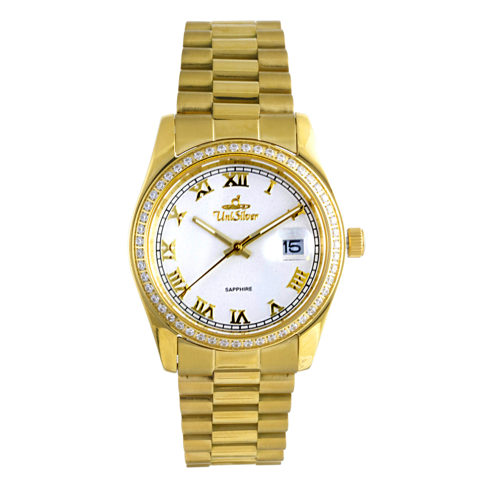 Command attention with the UniSilver TIME Remus Ilustrea, a stainless-steel timepiece crafted with refined elegance. Featuring Roman numeral hour indices and a bezel adorned with brilliant, light-catching crystals, this watch delivers a distinguished look. Bold yet timeless, the Remus Ilustrea brings together polished steel, classic detailing, and everyday versatility — a statement piece for those who appreciate sophistication without excess.