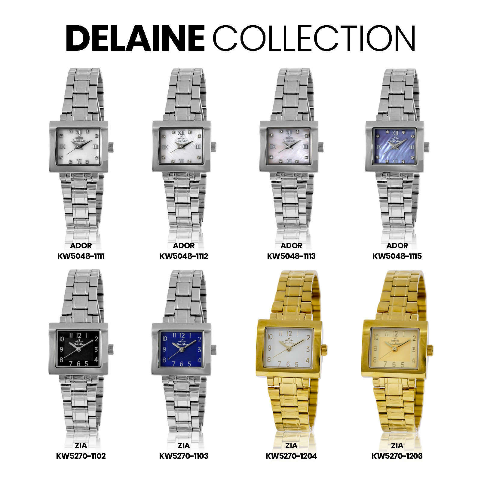 Radiate sophistication with the Delaine Ador timepiece from UniSilver TIME. This gold-plated accessory gleams with its sleek bracelet. The focal point - the off-white dial - sparkles marvelously with crystals for hour indices. The rectangular-shaped dial is the perfect statement for this timeless watch. Watch Care (Stainless Steel Case & Bracelet · Sapphire Crystal) a.) Made for everyday moments. Wipe with a soft, dry cloth to keep it looking its best. b.) Avoid contact with chemicals, perfumes, and extreme heat. c.) Sapphire crystal resists scratches, but avoids hard impacts. d.) Follow the indicated water-resistance rating and keep the crown secured. e.) Store in a dry place when not in use. Periodic servicing helps maintain optimal performance. Over time, fine marks on stainless steel reflect a watch well worn — and well lived.