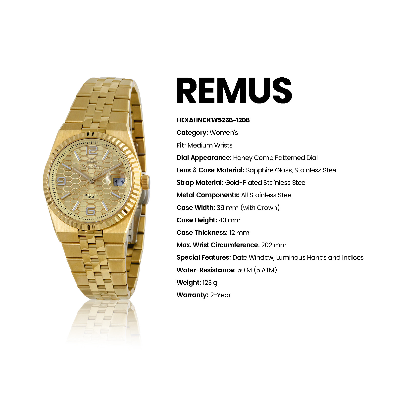 Featuring luminous hands and markers, a handy date function, and 50M water resistance, the Remus Hexaline is designed to keep up with both your daily routine and special occasions.
