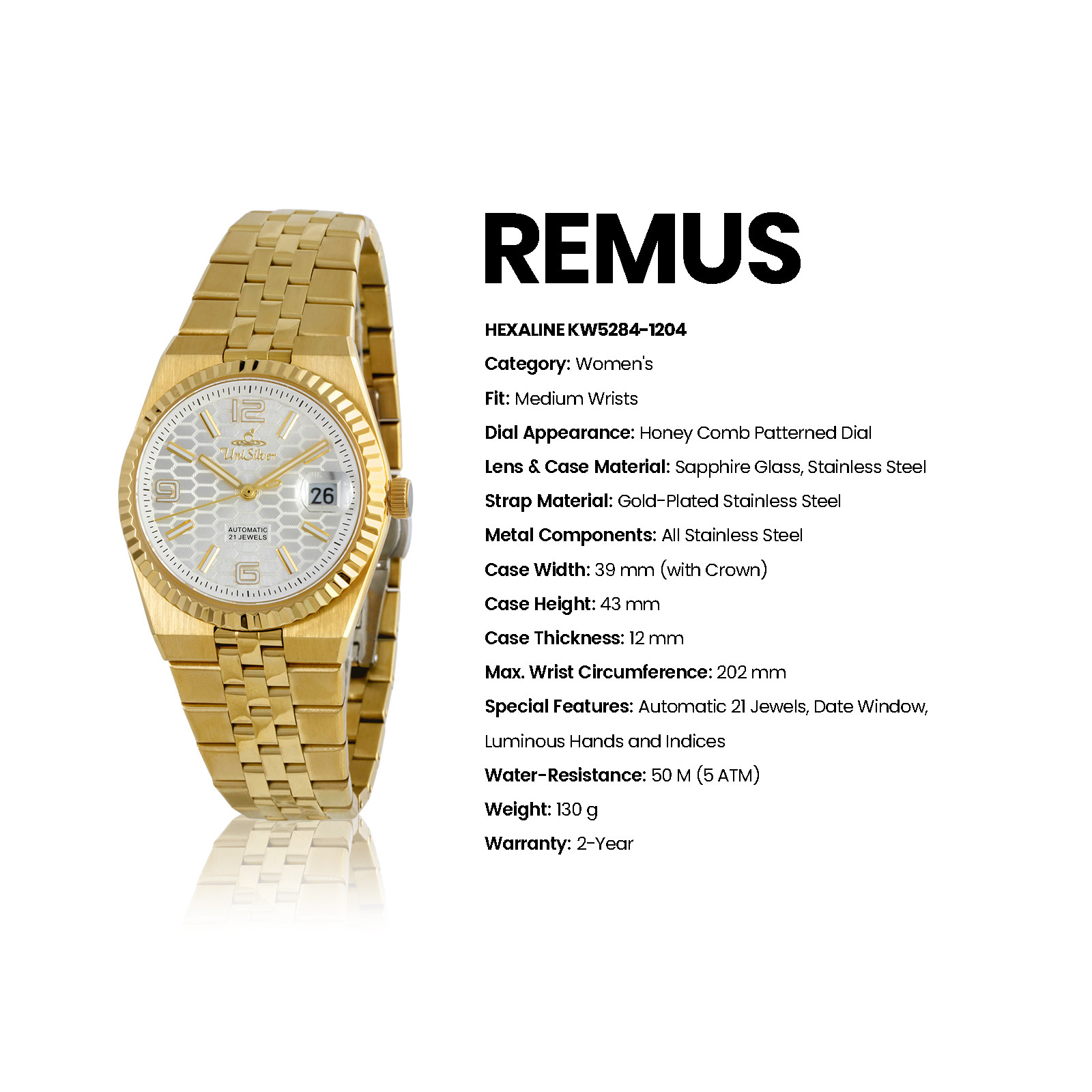 Introducing the Remus Hexaline a refined blend of modern style and mechanical craftsmanship for today’s woman. Its sleek analog face is enhanced by a subtle honeycomb texture, adding depth to its elegant design.