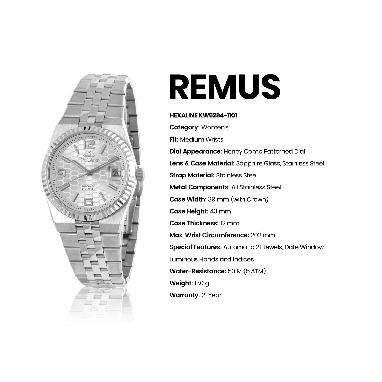 Introducing the Remus Hexaline a refined blend of modern style and mechanical craftsmanship for today’s woman. Its sleek analog face is enhanced by a subtle honeycomb texture, adding depth to its elegant design.