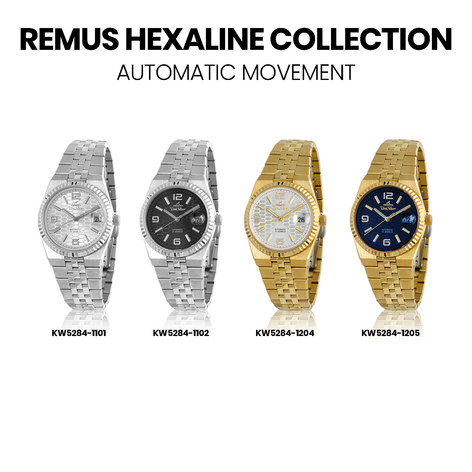 Complete with luminous markers, a date display, and 50M water resistance, the Remus Hexaline effortlessly transitions from daily moments to special occasions.