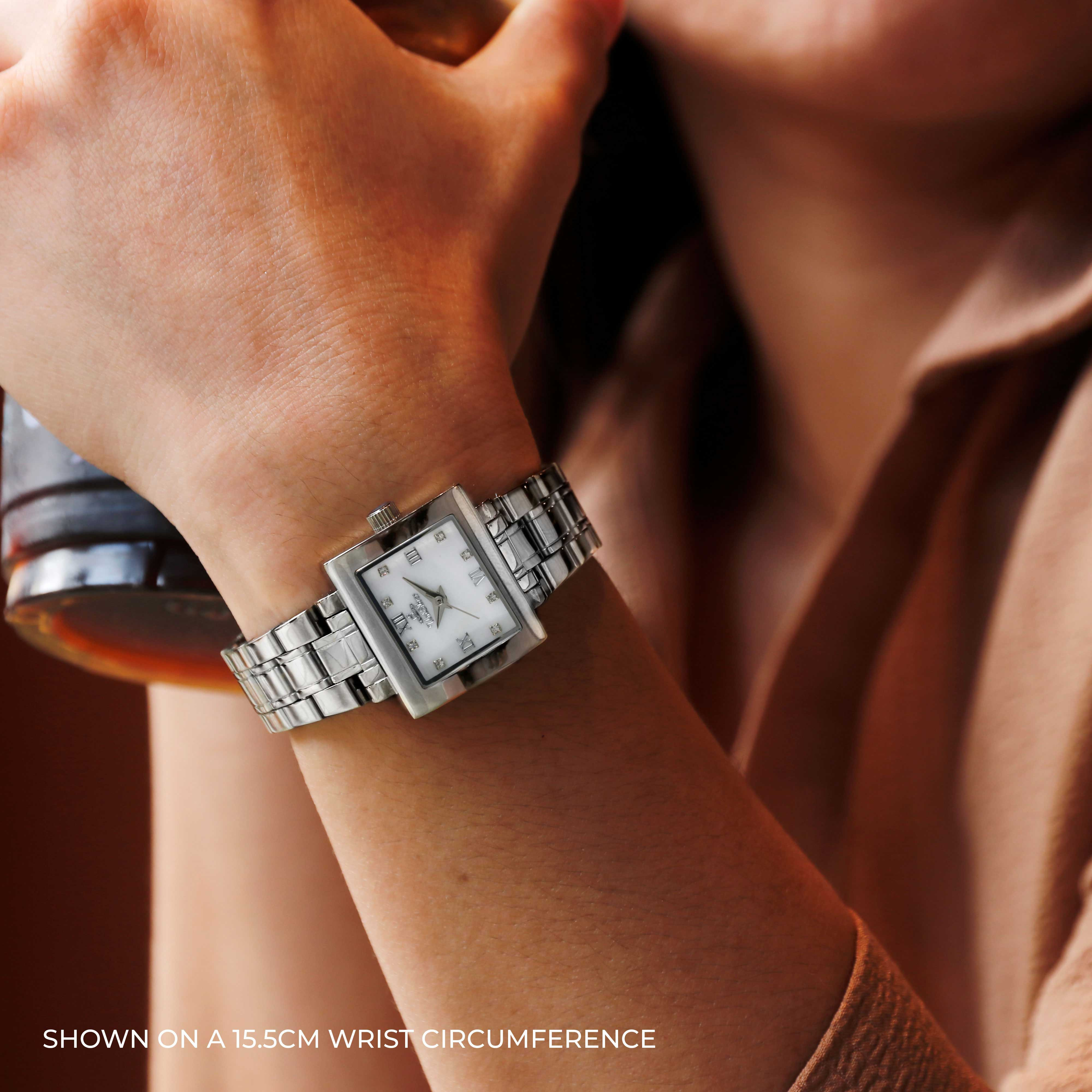 Radiate sophistication with the Delaine Ador timepiece from UniSilver TIME. This gold-plated accessory gleams with its sleek bracelet. The focal point - the off-white dial - sparkles marvelously with crystals for hour indices. The rectangular-shaped dial is the perfect statement for this timeless watch. Watch Care (Stainless Steel Case & Bracelet · Sapphire Crystal) a.) Made for everyday moments. Wipe with a soft, dry cloth to keep it looking its best. b.) Avoid contact with chemicals, perfumes, and extreme heat. c.) Sapphire crystal resists scratches, but avoids hard impacts. d.) Follow the indicated water-resistance rating and keep the crown secured. e.) Store in a dry place when not in use. Periodic servicing helps maintain optimal performance. Over time, fine marks on stainless steel reflect a watch well worn — and well lived.