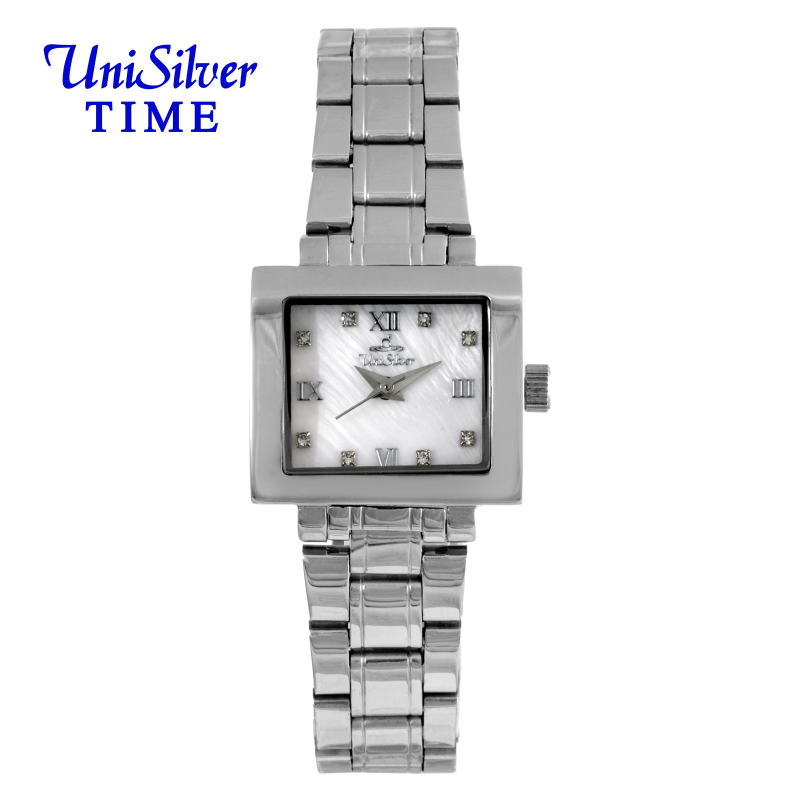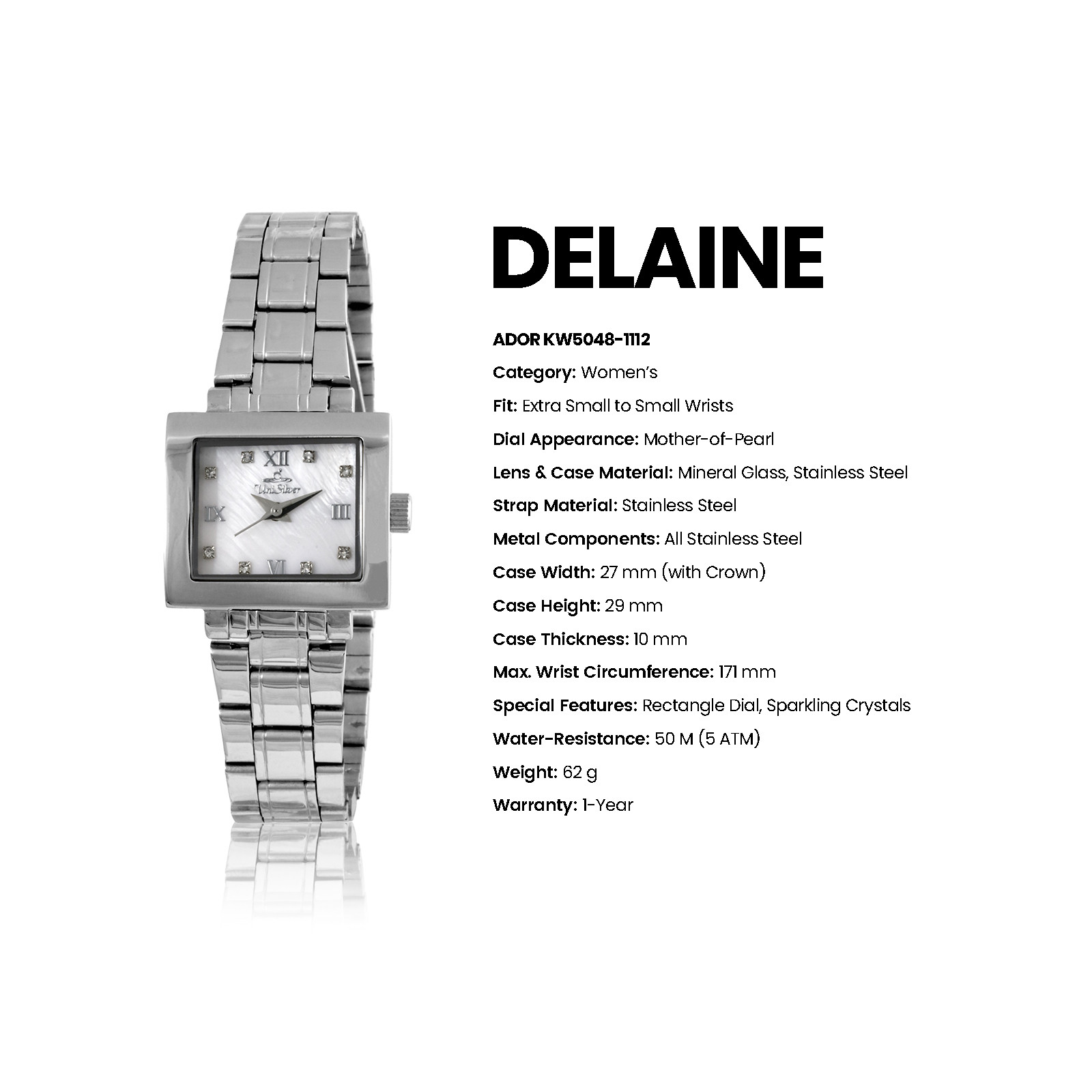 Radiate sophistication with the Delaine Ador timepiece from UniSilver TIME. This gold-plated accessory gleams with its sleek bracelet. The focal point - the off-white dial - sparkles marvelously with crystals for hour indices. The rectangular-shaped dial is the perfect statement for this timeless watch. Watch Care (Stainless Steel Case & Bracelet · Sapphire Crystal) a.) Made for everyday moments. Wipe with a soft, dry cloth to keep it looking its best. b.) Avoid contact with chemicals, perfumes, and extreme heat. c.) Sapphire crystal resists scratches, but avoids hard impacts. d.) Follow the indicated water-resistance rating and keep the crown secured. e.) Store in a dry place when not in use. Periodic servicing helps maintain optimal performance. Over time, fine marks on stainless steel reflect a watch well worn — and well lived.