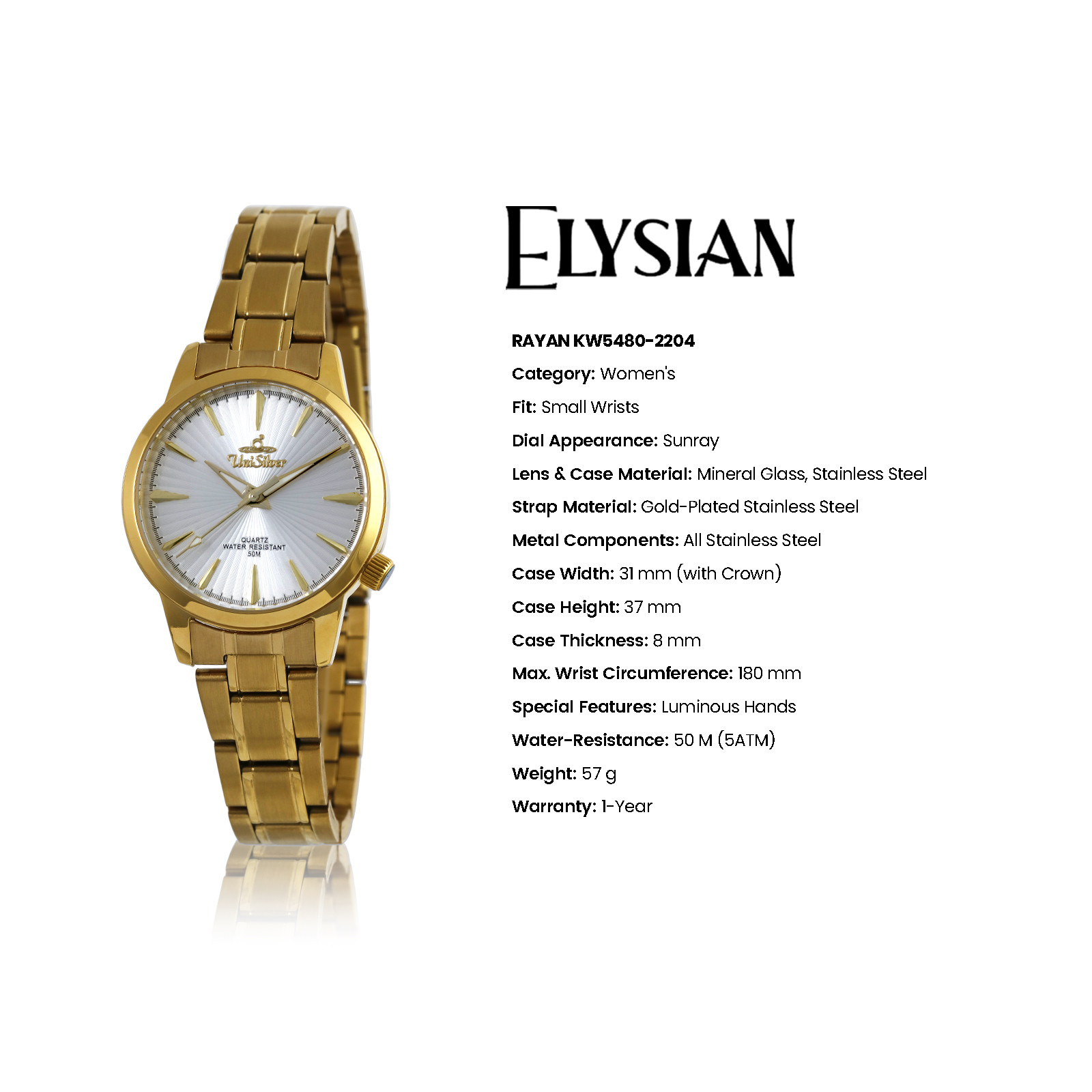 The Elysian Rayan Women’s Watch is a celebration of timeless elegance and graceful design. Crafted with meticulous attention to detail, it embodies sophistication in every element – from its delicate design to its refined finish. This exquisite timepiece transcends fleeting trends, offering a classic charm that enhances any ensemble. More than just a watch, it is a statement of poise and confidence for the woman who appreciates true luxury.