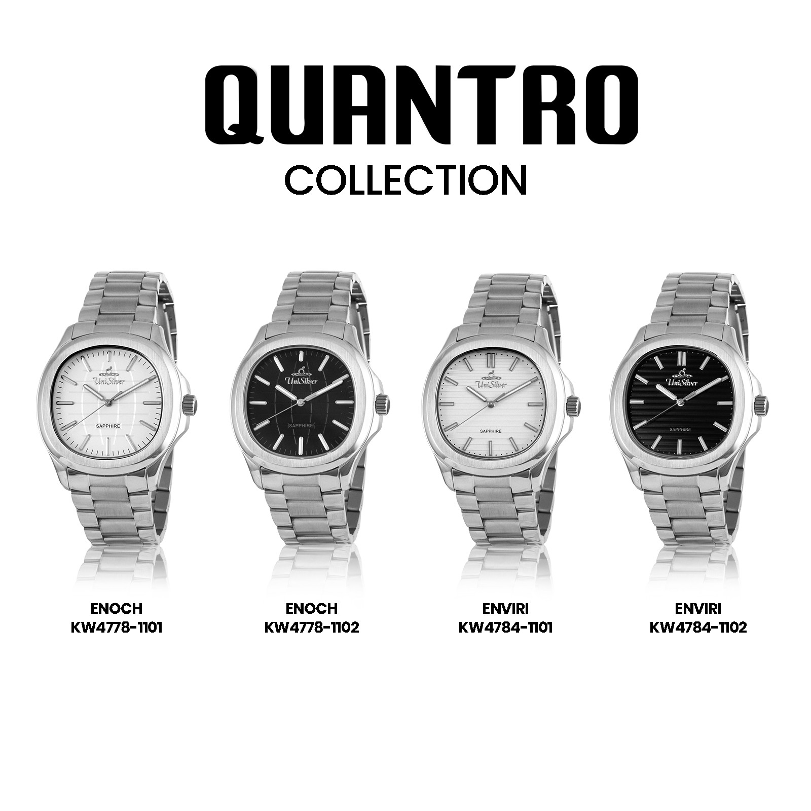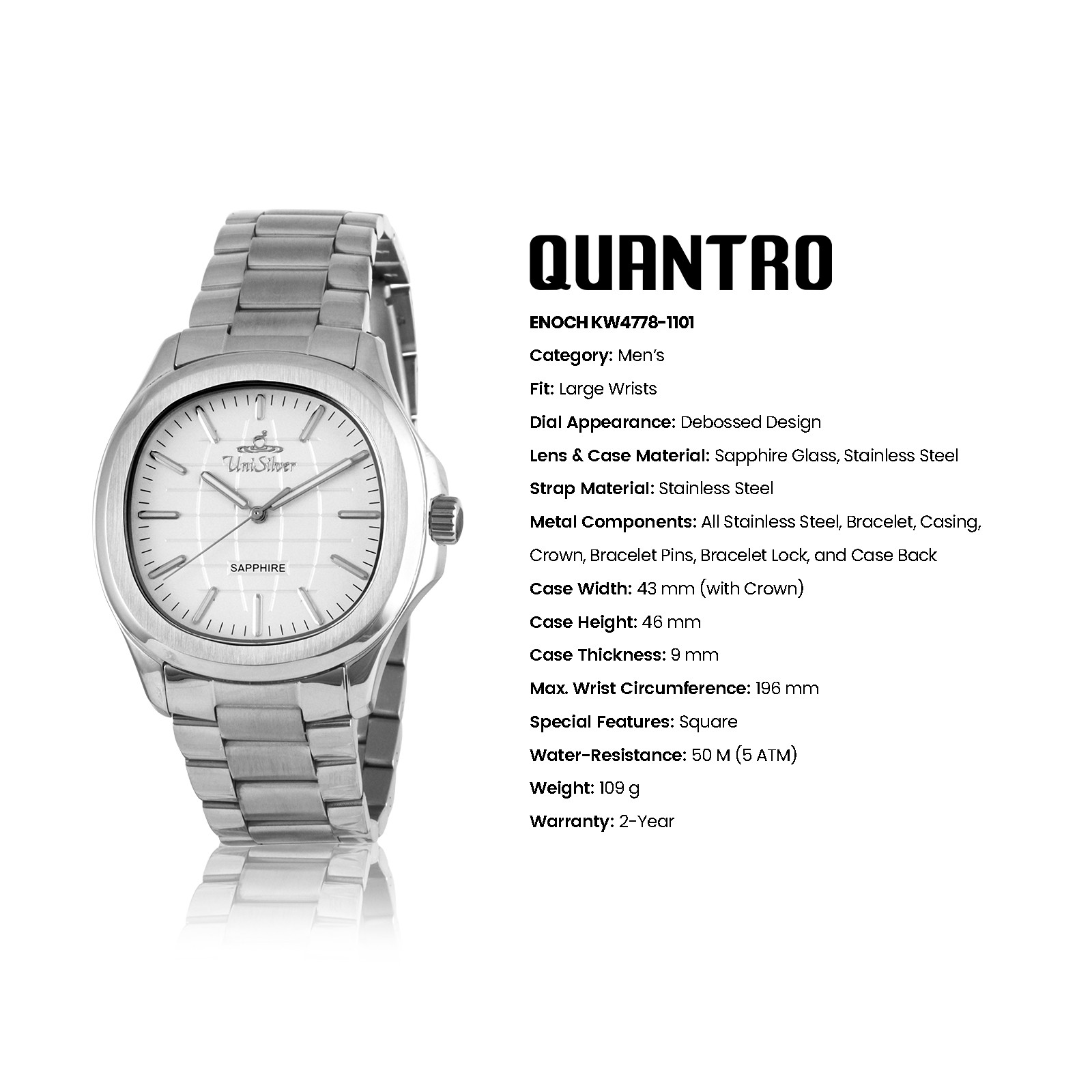 The UniSilver TIME Quantro Enoch men’s watch showcases timeless sophistication with a clean white analog dial housed in a distinctive square case. Crafted entirely from silver stainless steel, it delivers durability with a sleek, modern appeal.