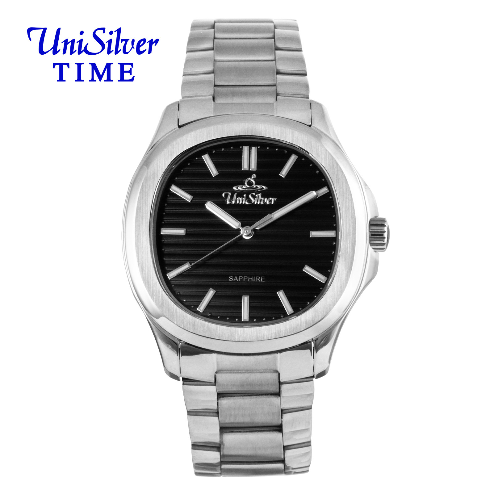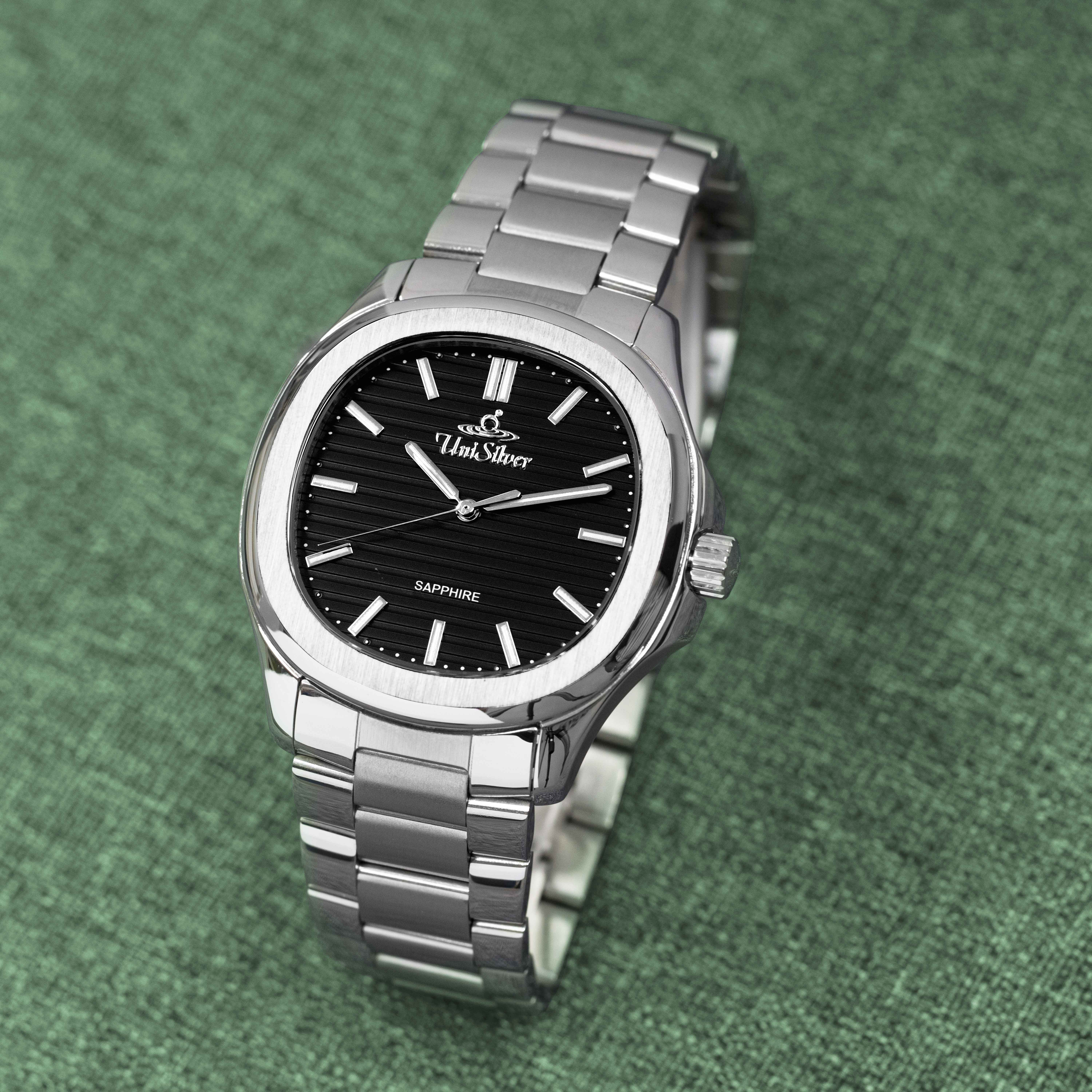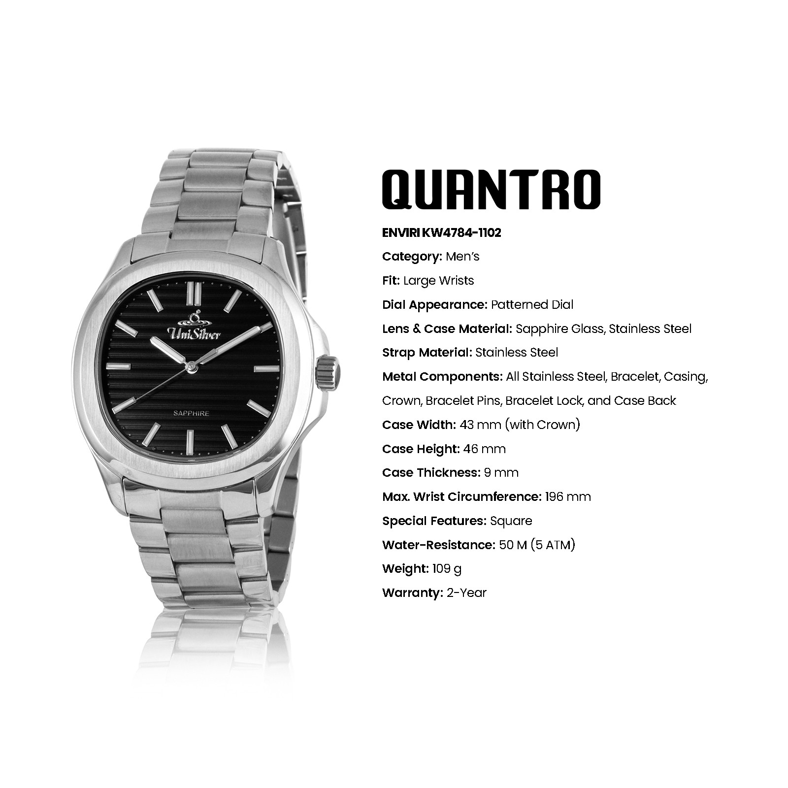 The UniSilver TIME Quantro Enviri men’s watch showcases timeless sophistication with a clean white analog dial housed in a distinctive square case. Crafted entirely from silver stainless steel, it offers both durability and a sleek, modern appeal. A scratch-resistant sapphire crystal protects the dial, ensuring long-lasting clarity and resilience through everyday wear. Designed to transition effortlessly from formal settings to casual occasions, the Quantro is a statement of understated elegance and dependable craftsmanship.