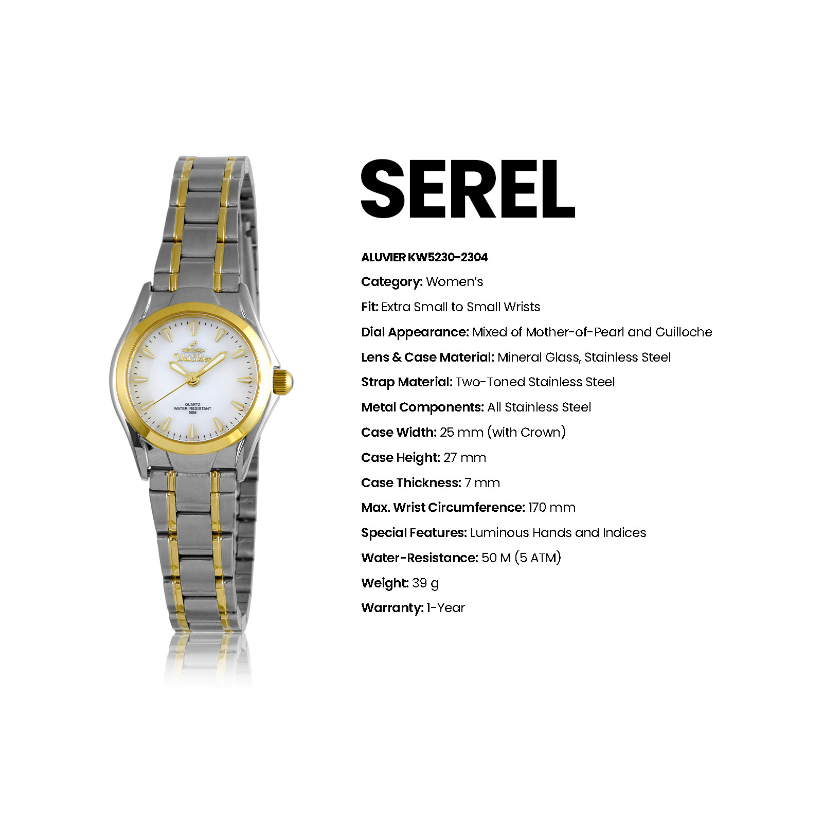 With its luminous hands, mother-of-pearl dial and refined detailing, Aluvier brings quiet sophistication to every moment. Powered by reliable Japan movement and crafted in stainless steel with 50M water resistance, it’s designed to shine effortlessly from day to night.